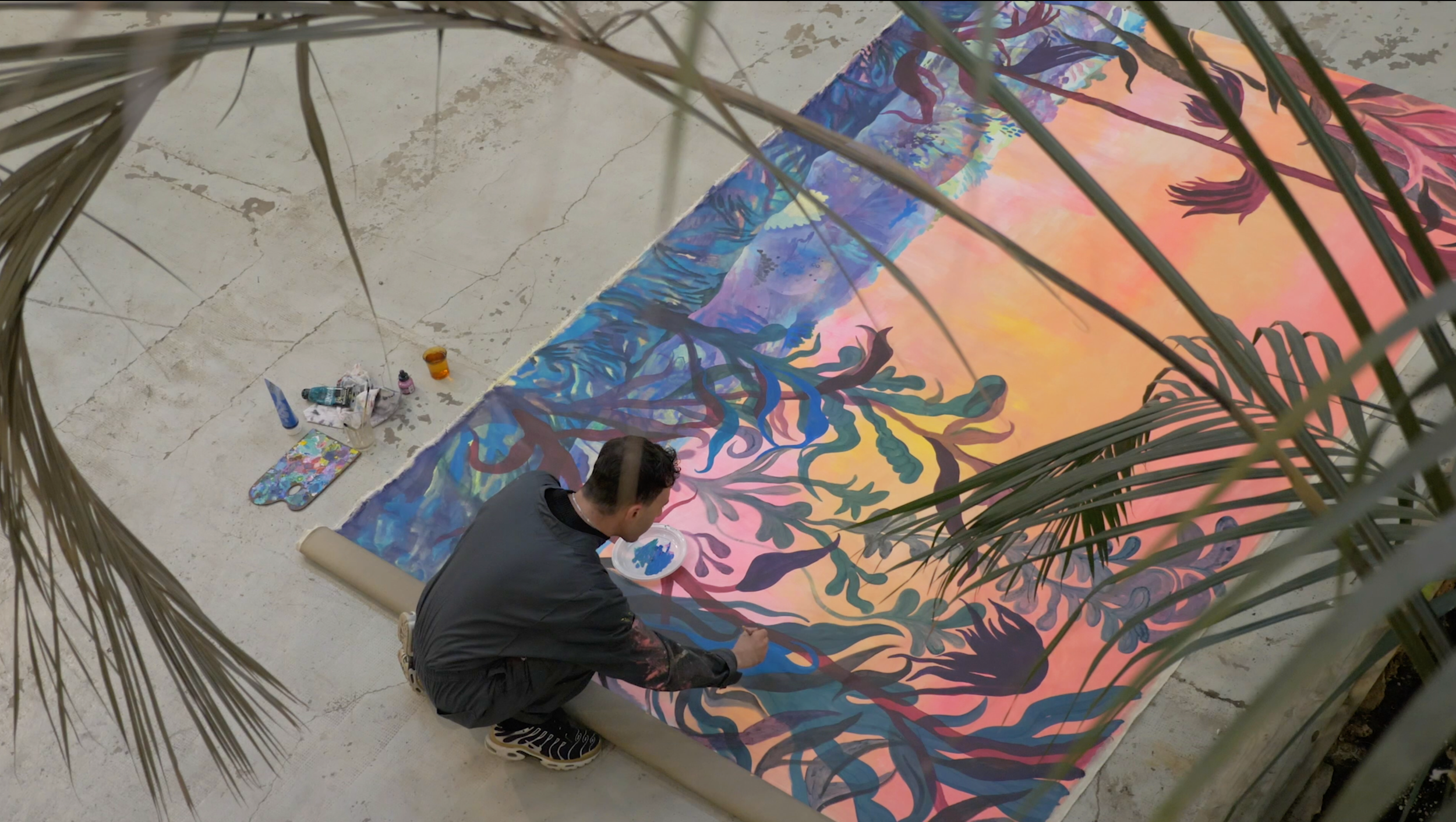 “A prolific artist, Florent Groc collaborates with several prestigious houses, including Hermès. His work has been presented at the Musée d’Orsay, as well as at the Villa Noailles, where the artist has blossomed in his first in-situ frescoes with flamboyant colors and enveloping motifs.