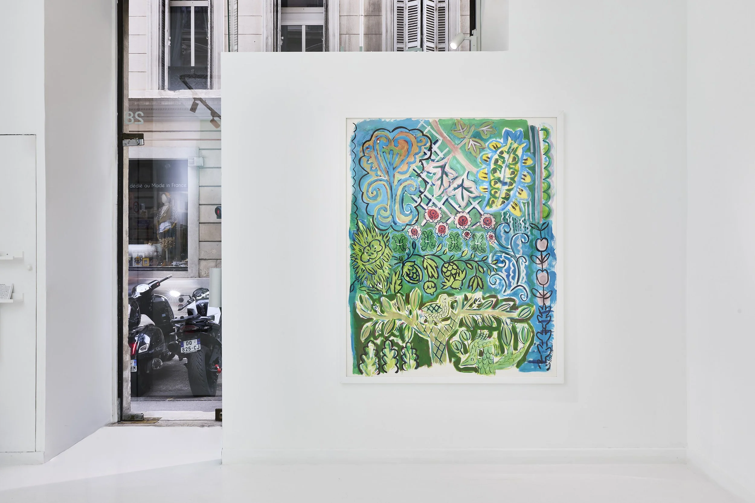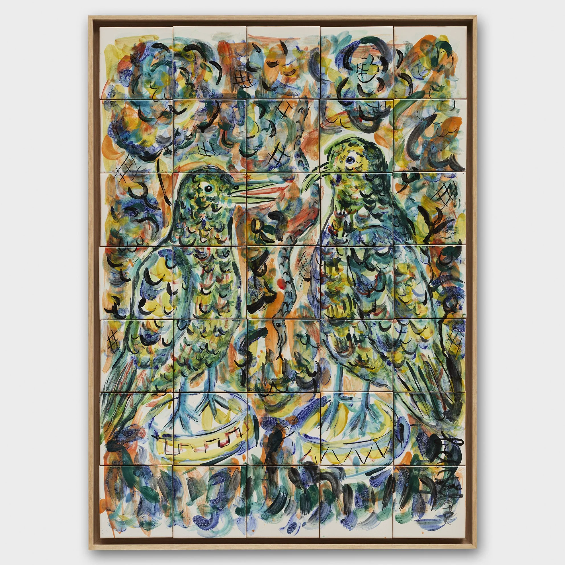 Bela Silva has created several public art projects, notably her surreal and joyful murals made of azulejo tilework for the Alvalade metro station in Lisbon. Inspired by the Portuguese traditional oral tale “the monkey with the short tail, who made a razor out of his tail, and a sardine out of a razor...”, the mural features a monkey pulling a long rope that is being held by seven women dressed in belle époque period clothing. Another detail shows a monkey walking past a woman with scissors. On another panel, the theme of the night is visually translated by the owl, a mysterious animal, a silent voyeur. Bold colours, rhythmic shapes, dancing women, playful monkeys, and flying dragonflies join forces to recount a folktale that incites us to think of other endings to the story. Bela Silva’s use of azulejos is not exclusively applied to large public works, many of her compositions come in different sizes and have an intimate character, such as the series of three wall ceramics (each less than one meter high) shown in the context of the Limonada exhibition at the Double V Gallery in Marseille. Here, birds merge with flowers in a composition that reminds us that nature is made as much of harmony as of tension.