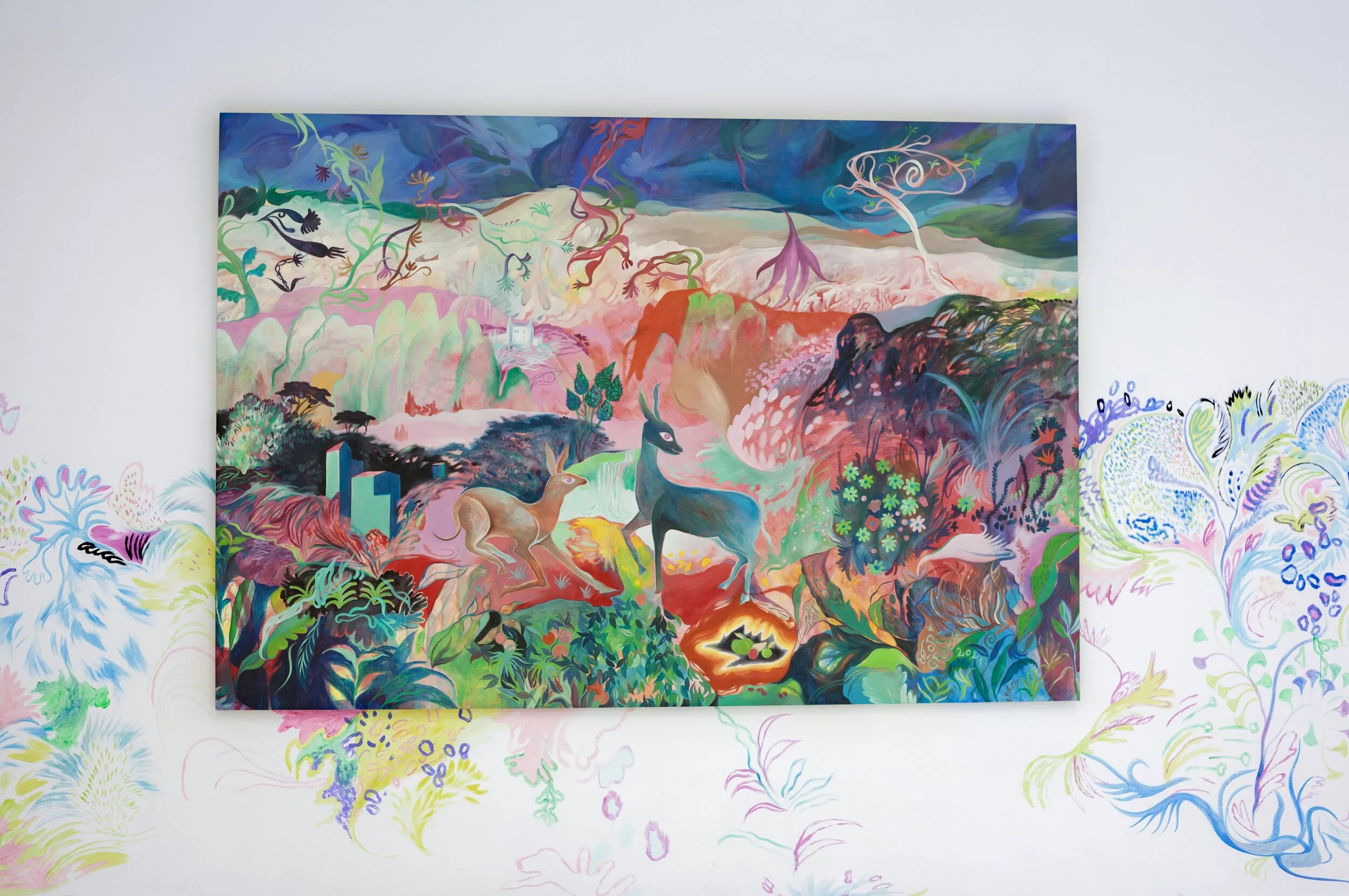 « Cette sélection de peintures fait échos à mon premier solo show chez Double V Gallery en janvier. Elles ont été pensées comme une suite, comme un deuxième chapitre. Elles se réfèrent à un vocabulaire mythologique déjà bien présent dans ma pratique : celui d’un monde qui s’effondre et qui apporte avec lui ses plus beaux monstres. On y retrouve mes arbres aux fruits toxiques, mes hommes-lapins, mes loups sans regard et mes animaux fuyants. J’ai voulu dessiner une saison cadenassée qui regarde, de loin, la possibilité d’un été plus libre et joyeux. Toutes ces peintures on été réalisées à l’huile sur toile à Marseille en 2021. »
